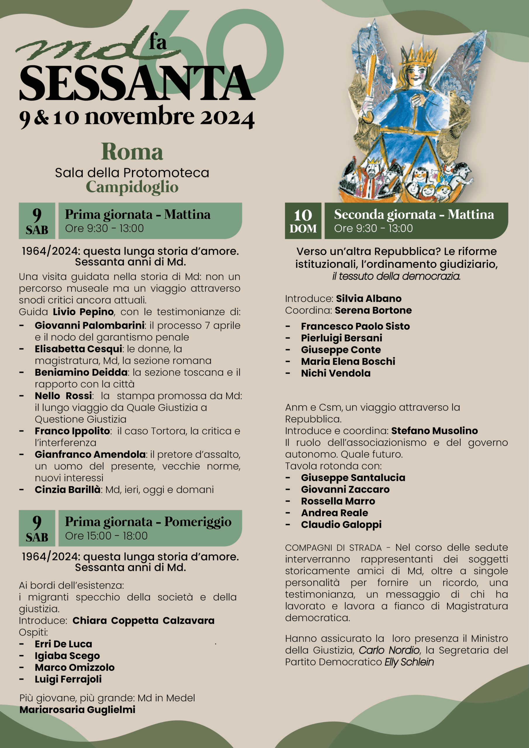 Il 9 e il 10 novembre Magistratura democratica celebra i suoi sessant’anni con un evento in due giornate presso la sala della Protomoteca del Campidoglio a Roma. Tra sabato e domenica, sono previste due sessioni: la prima intitolata “1964/2024: questa lunga storia d’amore”, la seconda “Verso un’altra Repubblica? Le riforme istituzionali, l’ordinamento giudiziario, il tessuto della democrazia”.