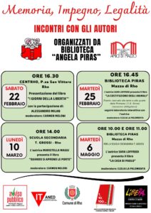 Da sabato 22 febbraio a martedì 6 maggio si svolgerà a Rho, in provincia di Mi, la rassegna “Memoria, impegno, legalità”: un ciclo di quattro incontri con altrettanti autori che presenteranno i loro libri.