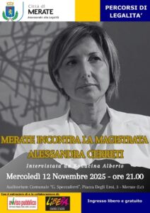 Mercoledì 12 novembre, dalle 21:00 alle 23:00, l’Assessorato alla Legalità del Comune di Merate (LC) organizza il convegno “Merate incontra la magistrata Alessandra Cerreti”.