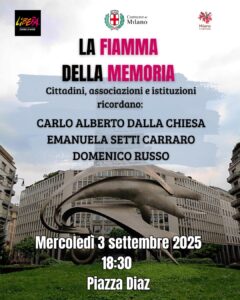 Cittadini, associazioni e istituzioni si ritrovano anche quest’anno a Milano per ricordare e fare memoria del sacrificio di Carlo Alberto dalla Chiesa, Emanuela Setti Carraro e Domenico Russo, uccisi da un commando di killer mafiosi in via Isidoro Carini a Palermo il 3 settembre del 1982.