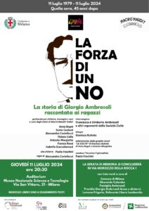 Il primo, alle 20:30 nell’auditorium del Museo Nazionale Scienza e Tecnologia, in via San Vittore 21, è la rappresentazione dello spettacolo “La Forza di un No” portato in scena dal Macrò Maudit Teàter: testo teatrale tratto dal libro di Gianluca Buttolo, il cui titolo fa riferimento esplicito al “no” con cui Giorgio Ambrosoli seppe resistere, a prezzo della vita, alle tremende pressioni e minacce di chi per cinque anni aveva tentato di bloccarne il lavoro. Con un saluto introduttivo del Direttore Generale del Museo, Fiorenzo Galli, e la partecipazione di familiari, testimoni dell’epoca, esponenti della società civile di oggi. Ingresso libero fino a esaurimento dei posti.