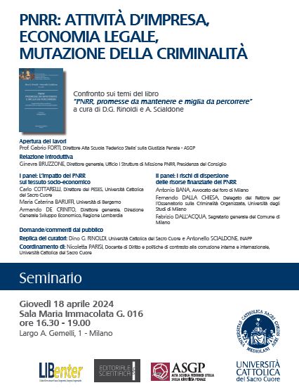 Si terrà giovedì 18 aprile 2024, dalle ore 16:30 alle ore 19:00, il seminario dal titolo “PNRR: attività d’impresa, economia legale, mutazione della criminalità” dedicato al confronto sui temi affrontati dal Prof. Dino G. Rinoldi e dal Dott. Antonello Scialdone nel libro “PNRR, promesse da mantenere e miglia da percorrere”.