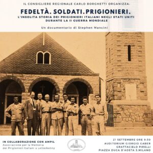 L’appuntamento è per il prossimo 21 settembre alle 09.30 presso l’Auditorium Giorgio Gaber presso Grattacielo Pirelli, via Duca d’Aosta 3, Milano, alla presenza del Consigliere Regionale Carlo Borghetti, dell’assessora ai Servizi Civici e Generali del Comune di Milano Gaia Romani, del regista Steve Mancini, dei rappresentanti di AMPIL e di una delegazione di figli dei soldati italiani prigionieri di guerra in Stati Uniti.