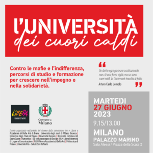 Evento organizzato nell’ambito del rinnovo della convenzione tra LIBERA e Accademia di Belle Arti di Brera, Università degli Studi di Milano Bicocca, Università degli Studi di Milano, Università Bocconi, Università Cattolica del Sacro Cuore di Milano, Humanitas, IED Istituto Europeo di Design, IULM Libera Università di Lingue e Comunicazione, NABA Nuova Accademia di Belle Arti, Politecnico di Milano, Università Vita – Salute San Raffaele