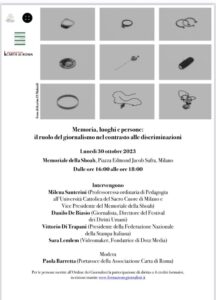 Lunedì 30 ottobre dalle 16:00 alle 18:00 a Milano presso il Memoriale della Shoah si svolgerà un incontro formativo organizzato dalla Associazione Carta di Roma “Memoria, luoghi e persone: il ruolo del giornalismo nel contrasto alle discriminazioni”.