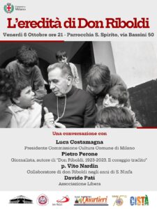 Intervengono Luigi Costamagna, presidente Commissione Cultura Comune di Milano; Pietro Perone, giornalista, autore del libro “Don Riboldi 1923-2023: Il coraggio tradito” (Ediz. San Paolo); padre Vito Nardin, collaboratore di don Riboldi negli anni di Santa Ninfa, Davide Pati, associazione Libera.