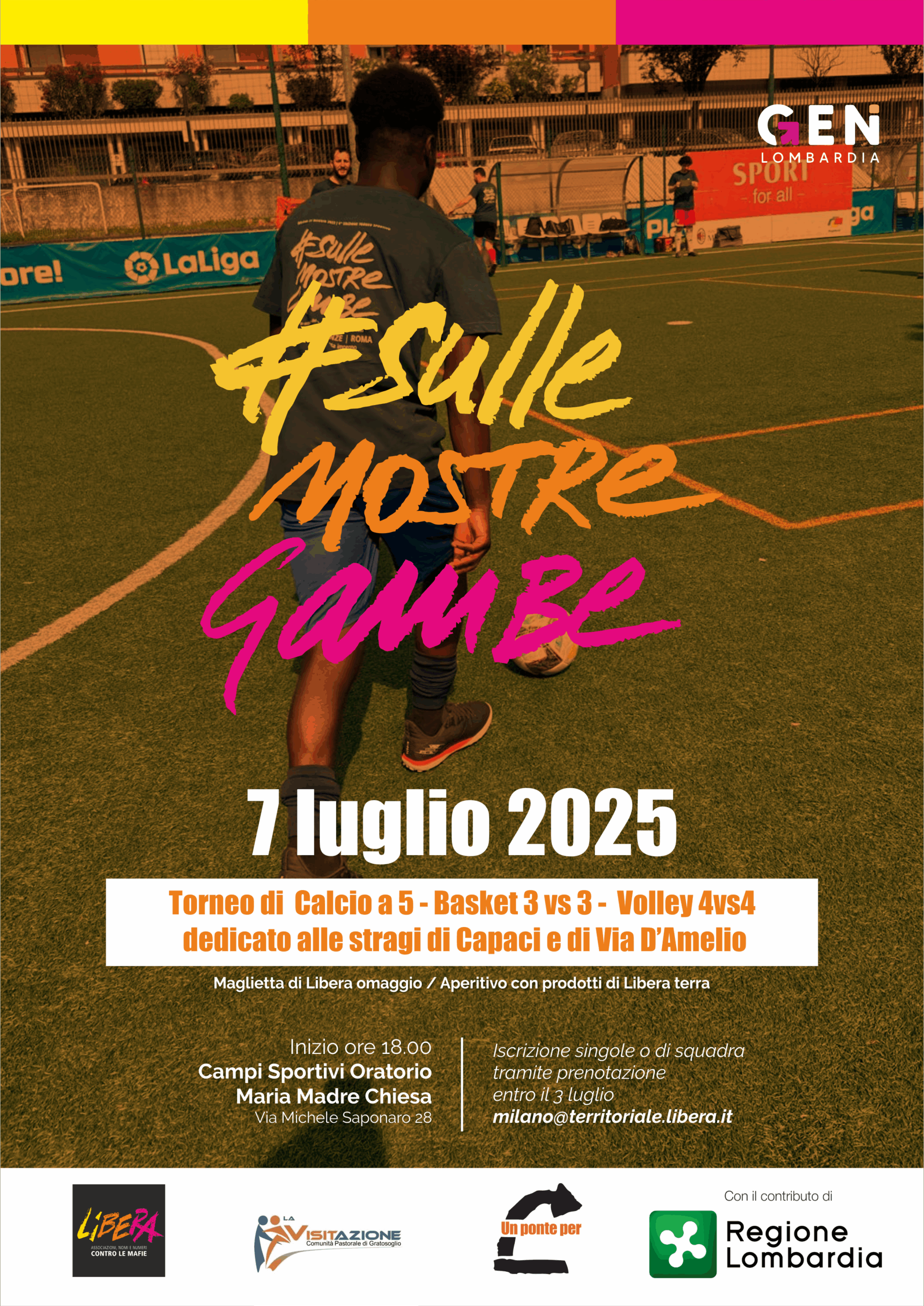 Lunedì 7 luglio a Milano, con inizio alle ore 18.30, la 6* edizione del torneo #sullenostregambe, promosso da Libera in collaborazione con Un Ponte per e la Comunità pastorale di Gratosoglio (Campi Oratorio Maria Madre Chiesa, via Michele Saponaro 28).