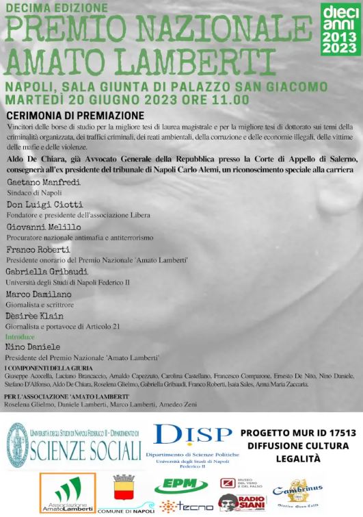 Si è celebrato oggi presso la Sala Giunta di Palazzo San Giacomo la decima edizione del Premio Nazionale “Amato Lamberti” alla presenza del sindaco di Napoli Gaetano Manfredi e con la relazione della professoressa Gabriella Gribaudi, Università degli Studi di Napoli Federico II e componente della giuria del premio.