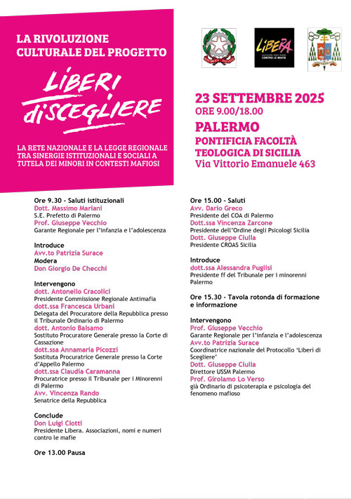 È questo lo spirito del convegno “La rivoluzione culturale del protocollo governativo Liberi di Scegliere. La rete nazionale di sinergie istituzionali e sociali a tutela dei minori in contesti mafiosi”, in programma martedì 23 settembre a Palermo, presso la Pontificia Facoltà Teologica, dalle ore 9 alle 18.