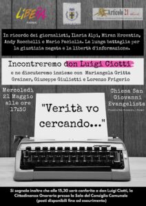Raccontare il ruolo del giornalismo nella battaglia contro le mafie e ricordare i cronisti morti nel mondo sarà il tema dell’intervento – aperto al pubblico fino ad esaurimento dei posti disponibili – che, mercoledì 21 maggio dalle 17,30 vedrà protagonista Don Luigi Ciotti – insieme al Comune di Parma, la Biblioteca Ilaria Alpi, Libera Parma e Art. 21 – nella Chiesa di San Giovanni Evangelista a Parma con l’intento di ricordare anche tre professionisti dell’informazione vittime di attentati.