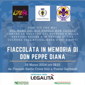 È in programma martedì 19 marzo, alle 18.15, la Fiaccolata in memoria di don Peppe Diana, promossa da Libera Parma, in collaborazione con Comune di Parma e Agesci, con il patrocinio della Regione Emilia-Romagna, in vista della XXIX Giornata Nazionale in ricordo delle vittime delle mafie che si svolgerà il 21 marzo a Roma.