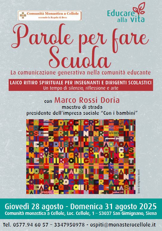 Da giovedì 28 a domenica 31 agosto, le “celle” dell’affascinante monastero situato nella campagna di San Gimignano, apriranno le loro porte a maestri, professori e presidi che avranno come “guida” il maestro di strada Marco Rossi Doria, oggi presidente dell’impresa sociale “Con i bambini”.