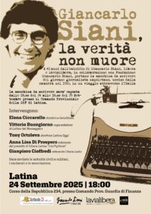 Dalle 18 del 24 settembre la macchina da scrivere di Siani sarà esposta presso la sede del Comando Provinciale della Guardia di Finanza di Latina in corso della Repubblica dove interverranno Vittorio Buongiorno, capo redazione del Messaggero di Latina, Tonj Ortoleva, direttore di Latina Oggi, Elena Ciccarello, direttrice della rivista La Via Libera, Anna Lisa Di Prospero referente Libera Latina e Gianpiero Cioffredi, referente Libera Lazio. Sono invitate le autorità civili e militari, i sindacati, le associazioni.