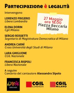 Con questo spirito, lunedì 27 maggio alle ore 18.00 in Piazza Beccaria a Milano, CGIL e Libera – Milano e Lombardia promuovono l’iniziativa pubblica “Partecipazione è legalità”.