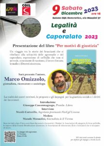 È per questo che il Coordinamento di Libera provinciale Livorno, il Presidio di Libera “Rossella Casini” Castagneto C.cci/San Vincenzo e la FLAI CGIL provinciale, organizzano l’incontro pubblico di sabato 9 dicembre a Donoratico, nel salone CGIL, in via Mazzini 37 (1° piano) alle ore 16,00 con la presenza del giornalista e sociologo Marco Omizzolo, il quale ci presenterà il suo ultimo libro “Per motivi di Giustizia”.