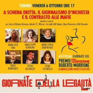 L’incontro è un’anteprima delle Giornate del Premio Morrione di fine ottobre ed è organizzato da associazione Amici di Roberto Morrione, Articolo 21, Riforma – Eco delle Valli Valdesi, Libera Piemonte e Ordine dei Giornalisti del Piemonte.
