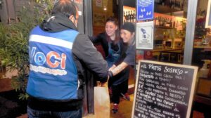 Titolo: “Il piatto sospeso”, dove le virgolette sono costituite da due cuori. Segue un invito al viandante o all’avventore: “Regala un piatto caldo per i senzatetto a Milano! Puoi garantire un piatto caldo della nostra cucina donando 5 euro…Noi faremo il resto! Ogni giovedì consegneremo ai volontari di Voci Onlus i piatti raccolti e preparati al momento. E c’è di più. Puoi essere tu a portarlo fisicamente o puoi lasciare un messaggio personalizzato. Regala un sorriso (di nuovo tra due cuoricini). Segue Iban con causale: Piatto sospeso”.