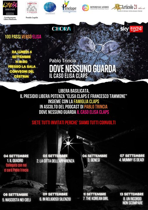 A partire dal 4 settembre e fino al 13 (tutte le sere fatta eccezione domenica 10 e il 12 per la presentazione del libro “Sono io Elisa Claps”) alle ore 18.00 nella sala convegni del Cestrim a Potenza, ci riuniremo con la famiglia Claps per ascoltare tutte le puntate del podcast. Nel corso del primo appuntamento sarà con noi, collegato online, l’autore Pablo Trincia.