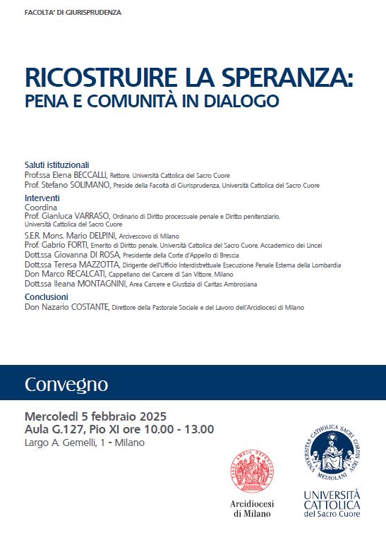La giornata sarà aperta dai saluti istituzionali della prof.ssa Elena Beccalli, Rettore dell’Università Cattolica del Sacro Cuore, e del prof. Stefano Solimano, Preside della Facoltà di Giurisprudenza. Tra gli interventi previsti, il prof. Gianluca Varraso, Ordinario di Diritto Processuale Penale e Diritto Penitenziario presso l’Università Cattolica, approfondirà il tema del sistema penale e delle sue sfide nel contesto contemporaneo. Monsignor Mario Delpini, Arcivescovo di Milano, rifletterà sul ruolo della misericordia e della comunità come luoghi di speranza e di rinascita. Il prof. Gabrio Forti, Emerito di Diritto Penale e Accademico dei Lincei, porterà il suo contributo sul potenziale trasformativo della giustizia, analizzando come essa possa contribuire al rafforzamento dei legami sociali. Interverranno inoltre la dott.ssa Giovanna Di Rosa, Presidente della Corte d’Appello di Brescia, e la dott.ssa Teresa Mazzotta, Dirigente dell’Ufficio Interdistrettuale di Esecuzione Penale Esterna della Lombardia, che si concentreranno sui percorsi di reintegrazione dei detenuti e sul ruolo della comunità nell’accompagnamento delle persone condannate.