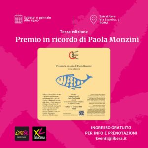 Siamo lieti di annunciare che quest’anno il Premio Paola Monzini si svolgerà a Roma, sabato 11 gennaio alle ore 15, presso gli spazi di Extralibera in via Stamira 5.