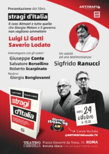 Mercoledì 29 ottobre alle ore 18:30, presso il Teatro Garbatella di Roma (Piazza Giovanni da Triora, 15), si terrà la presentazione del nuovo libro di Luigi Li Gotti e Saverio Lodato, “Stragi d’Italia. Il caso Almasri e tutto quello che Giorgia Meloni e il governo non vogliono ammettere” (Fuoriscena, 2025).