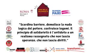 La Casa della Solidarietà Stefano Rodotà è un progetto in coprogettazione tra il Municipio II e la Rete dei Numeri Pari e nasce dall’impegno per trasformare un bene confiscato alla criminalità organizzata in un luogo di promozione dei diritti sociali, di ascolto, condivisione e speranza, aperto a tutte e tutti. La sua missione è quella di fornire servizi, formazioni e laboratori gratuiti alle fasce della popolazione che oggi sono più esposte o che già subiscono il ricatto mafioso sul territorio: persone impoverite; che vivono in condizioni di disagio sociale e/o culturale; a rischio esclusione sociale o che subiscono già una condizione di esclusione. Mette insieme realtà sociali impegnate a promuovere giustizia sociale, ambientale ed ecologica, consapevoli che nell’attuale fase storica nessun@ ce la fa da sol@ e solo la cooperazione massimizza il risultato.