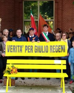 C’erano i genitori di Giulio, Paola e Claudio, all’inaugurazione della panchina di via Roma. Ed hanno voluto ringraziare tutti i presenti, ricordando l’impegno che li attende lunedì per la riapertura del processo. “La collocazione della panchina gialla è strategica e risponde alla nostra volontà – sono state le parole di Marina Cuzzi, presidente dell’Anpi – di posizionarla nel cuore della città, ben visibile a quanti da qui passano quotidianamente, nello spazio esterno del palazzo da dove si governa e si amministra la comunità, vicino al monumento alla Resistenza che ricorda i drammi vissuti dalla nostra gente nella seconda guerra mondiale. Ricorda anche la ribellione alla dittatura, il riscatto di un popolo e la ricostruzione del nostro Paese, a due passi dalla biblioteca, volano di tante iniziative di pregio ma, soprattutto, visitata, “usata” da tanti studenti per le loro ricerche, i loro studi e scelta dai ragazzi ronchesi come luogo preferito per i loro incontri”. E se, come ha detto il primo cittadino, la ricerca della verità deve riguardare una quotidianità, onorare la figura di Giulio Regeni è il simbolo della battaglia per la tutela dei diritti umani.