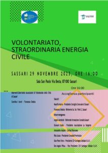 È in programma a Sassari mercoledì 29 Novembre 2023, alle ore 16 l’incontro sul tema “Volontariato, straordinaria energia civile”.