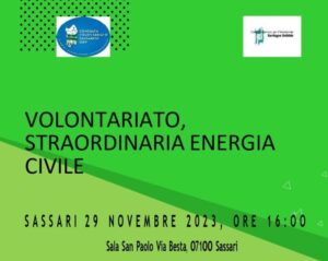 È in programma a Sassari mercoledì 29 Novembre 2023, alle ore 16 l’incontro sul tema “Volontariato, straordinaria energia civile”.