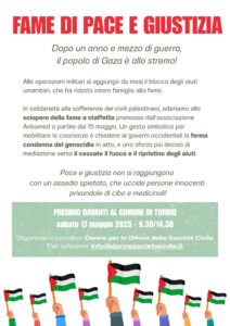Sabato 17 maggio, dalle 9.30 alle 14.30, ci sarà un presidio davanti al Comune di Torino delle realtà che aderiscono allo sciopero della fame a staffetta in solidarietà con la popolazione di Gaza.
