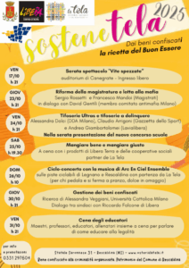È in quest’ottica che per il terzo anno consecutivo l’osteria sociale promuove “SosteneTela”, una settimana della legalità fatta di incontri, musica, pedalate ed enogastronomia studiata a sei mani dalla cooperativa che gestisce il locale con l’amministrazione comunale e il presidio Libera di Legnano, con il supporto di ArcEnCiel Ensemble e FIAB.