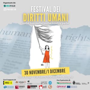 La seconda edizione del Festival dei diritti umani è organizzato dalle Associazioni Geopolis e Paideia ed è realizzato con il patrocinio di Regione Emilia Romagna, Comune di Bologna, Quartiere Santo Stefano e Progetto Erasmus Mundus Master Degree GEMMA (Women’s and Gender Studies).