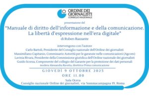 In occasione della presentazione della decima edizione del Manuale di diritto dell’informazione e della comunicazione. La libertà d’espressione nell’era digitale (edizioni Wolsters Kluwer) di Ruben Razzante, docente di diritto dell’informazione all’Università Cattolica del Sacro Cuore di Milano, l’Ordine nazionale dei giornalisti, organizza giovedì 9 ottobre alle ore 11:00 un incontro nella sala Ocera, sede del Consiglio Nazionale, in via Sommacampagna, 19, a Roma.