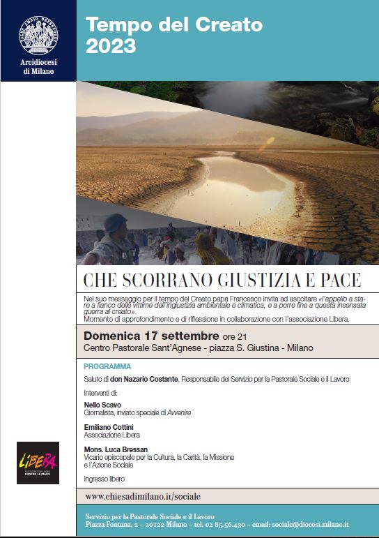 In occasione del Tempo del Creato, il Servizio per la pastorale sociale e del lavoro della Diocesi propone un momento di approfondimento e di riflessione in collaborazione con l’associazione Libera. L’incontro si terrà domenica 17 settembre alle 21 presso il Centro pastorale Sant’Agnese di piazza Santa Giustina a Milano sul tema «Che scorrano giustizia e pace».