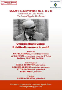 Il Movimento Agende Rosse di Torino, con il patrocinio della Città di Torino, organizza un incontro pubblico dedicato al caso dell’omicidio di Bruno Caccia, dal titolo: “Omicidio Bruno Caccia – Il diritto di conoscere la verità”.