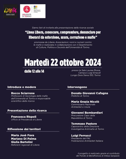 Martedì 22 ottobre, dalle 12 alle 14, presso la Sala Laurea Rossa del Campus Luigi Einaudi, si terrà un convegno per presentare i dati raccolti ed elaborati attraverso la ricerca sociale “Linea Libera: conoscere, comprendere e denunciare per liberarsi da estorsione, usura, corruzione e mafie”, promossa da Libera – associazioni, nomi e numeri contro le mafie e realizzata in collaborazione con il Dipartimento di Culture, Politica e Società dell’Università di Torino.