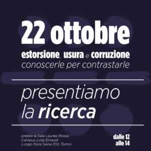 Martedì 22 ottobre, dalle 12 alle 14, presso la Sala Laurea Rossa del Campus Luigi Einaudi, si terrà un convegno per presentare i dati raccolti ed elaborati attraverso la ricerca sociale “Linea Libera: conoscere, comprendere e denunciare per liberarsi da estorsione, usura, corruzione e mafie”, promossa da Libera – associazioni, nomi e numeri contro le mafie e realizzata in collaborazione con il Dipartimento di Culture, Politica e Società dell’Università di Torino.