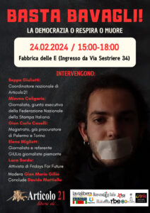 Sabato 24 febbraio è in programma a Torino l’evento “Basta Bavagli! La democrazia o respira o muore”, organizzato da Articolo 21 Piemonte in collaborazione con diverse realtà.