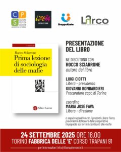 Mercoledì 24 settembre vi aspettiamo alla Fabbrica delle E – corso Trapani 91/b – alle ore 18 per la presentazione del libro “Prima lezione di sociologia delle mafie” di Rocco Sciarrone.