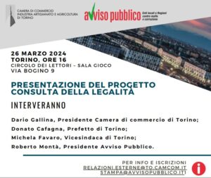 Martedì 26 marzo, al Circolo dei Lettori di Torino, presso la Sala Gioco, dalle ore 16, si svolgerà la presentazione del progetto della Consulta della legalità promosso dalla Camera di commercio di Torino e Avviso Pubblico.