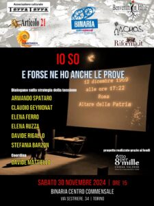 Sabato 30 novembre a partire dalle ore 15 presso gli spazi di “Binaria Centro Commensale” di via Sestriere 34 a Torino lo faranno i referenti del gruppo di lavoro “Sotto i fanali, l’oscurità”: l’analista politico Davide Rigallo, la psicologa Stefania Barzon, l’attrice Elena Ruzza e il giornalista Claudio Geymonat.
