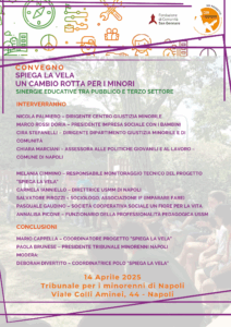 Lunedì 14 aprile alle ore 9, presso il Tribunale per i Minorenni di Napoli, si terrà il convegno “Spiega la Vela: un cambio di rotta per i minori”, un momento di confronto istituzionale e tecnico-educativo dedicato alla prevenzione della devianza minorile e alla costruzione di modelli alternativi alle sole misure repressive.