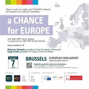 Una Chance per l’Europa: i 5 punti e le 12 proposte del Manifesto politico di Libera e delle associazioni della società civile europea riunite nella rete CHANCE – Civil Hub Against orgaNised Crime in Europe, saranno presentati giovedì 7 dicembre dalle 10.30 alle 13.30 presso l’Edificio Spinelli del Parlamento europeo, nella sala 2g3. Saranno presenti Roberta Metsola, Presidente del Parlamento europeo, Luigi Ciotti, Presidente di Libera , eurodeputati e rappresentanti della società civile.