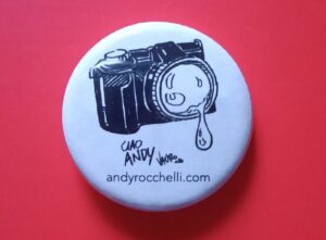 Le spillette con la macchina fotografica che piange furono un’affettuosa iniziativa degli amici di Andrea, riunitisi in un’associazione che porta il suo nome da scout, “volpe scapigliata” e il disegno di mano di Vauro Sanesi esprime in pochi tratti la nostalgia di una vita, e di un talento, brutalmente spezzati.
