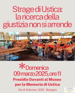 La ricerca della giustizia non si arrende! Ritroviamoci davanti al Museo per la memoria di Ustica, a Bologna domenica 9 marzo alle ore 11. Chiediamo verità e giustizia per le vittime della Strage di Ustica.