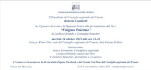Martedì 24 ottobre alle 12.30 nella sala Oriana Fallaci di Palazzo Ferro Fini, sarà presentato il nuovo libro di Leoluca Orlando e Constanze Reuscher “Enigma Palermo. La politica, la paura, il futuro. Storia di una città e del suo sindaco” (Rizzoli editore)