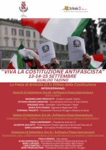 Finalmente ci siamo: dal 13 al 15 settembre a Gualdo Tadino (PG) ci sarà la festa nazionale di Articolo 21 “Viva la Costituzione Antifascista”.