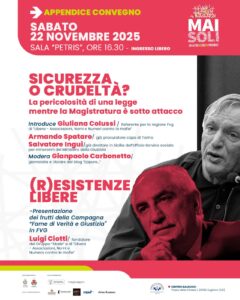 Alle ore 16.30, il secondo appuntamento, rivolto al vasto pubblico su “Sicurezza o crudeltà? La pericolosità di una legge mentre la magistratura è sotto attacco”, con al centro il decreto sicurezza, di recente divenuto legge.