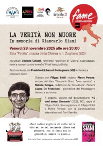 L’introduzione di Giuliana Colussi, referente regionale di “Libera”, e la testimonianza del Presidio di “Libera” di Portogruaro (VE), intitolato proprio a Giancarlo Siani, daranno avvio alla serata, che proseguirà con il dialogo, moderato dalla giornalista del Messaggero Veneto e scrittrice Luana De Francisco, con Filippo Soldi, regista del documentario “40 anni senza Giancarlo Siani”, Pietro Perone, autore del libro edito da San Paolo “Giancarlo Siani. Terra nemica” a cui il docufilm fa riferimento, e Natalie Sclippa, redattrice de “lavialibera”, rivista bimestrale fondata da “Libera” e “Gruppo Abele”, che di recente ha dedicato un numero monografico al giornalista partenopeo.